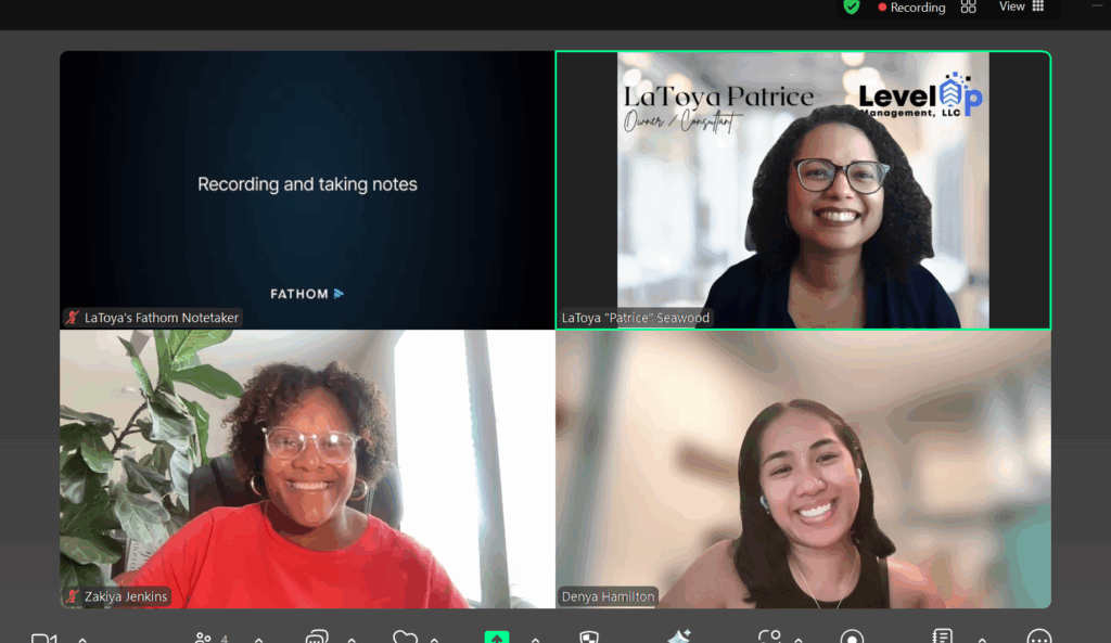This month’s conversation brought together three dynamic women—Zakiya Jenkins (Grace Fitness), Denya Hamilton (Sow and Tell), and host LaToya Seawood (Level Up Management). Though representing different industries and locations, they discussed a shared, powerful common ground of purpose, and the often invisible challenge of getting out of our own way.